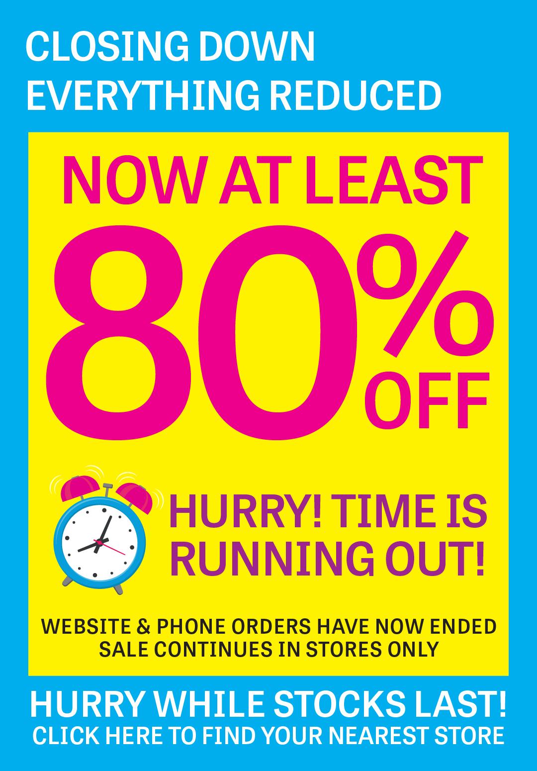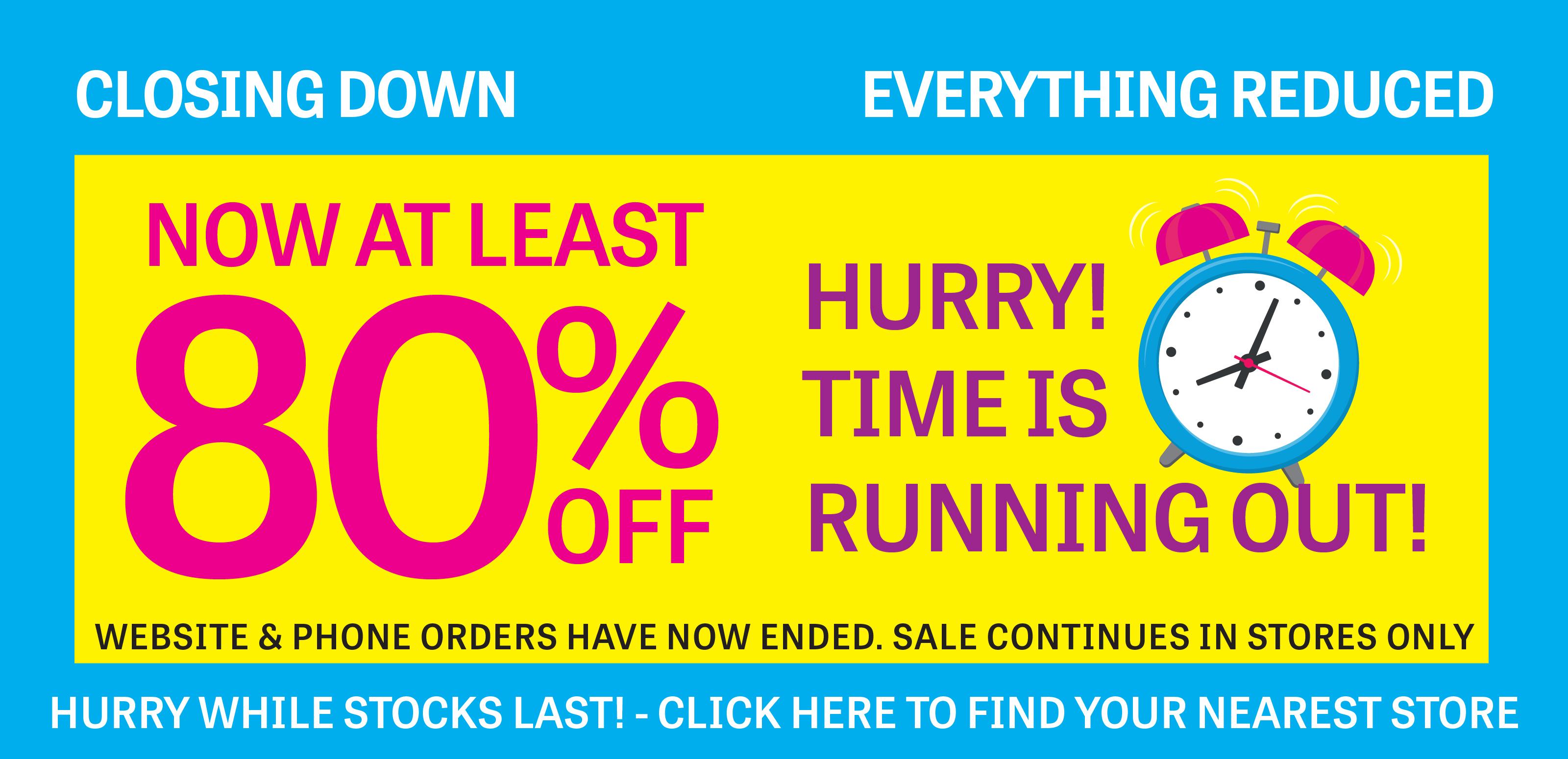 messageDesktop: Website and phone order now closed- Shop in store for a limited time | 2 DAYS LEFT TO SHOP AT LEAST 80% OFF EVERYTHING IN-STORE